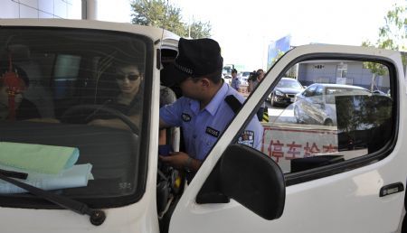 A policeman checks a vehicle at a checkpoint in Beijing, capital of China, Sept. 15, 2009, in a move to secure the celebrations for the 60th anniversary of the founding of the People's Republic of China, whose National Day falls on Oct. 1.(Xinhua/Li Wen)