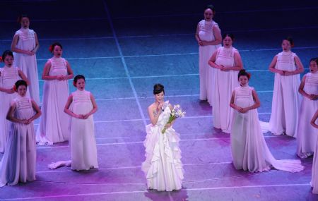 嵞ong Zuying (C), a well-known singer of Chinese folk songs, sings a song of the musical "Road to Revival" at the Great Hall of the People in Beijing, capital of China, on Sept. 20, 2009. The grand musical made its debut here on Sunday night to mark the 60th anniversary of the founding of the People's Republic of China. (Xinhua/Chen Shugen)