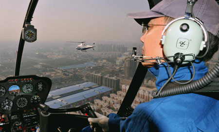 An aviation policeman pilots the police helicopter in a routine patrol aviation for the tightening the orderly security guarding for the grand celebration of the National Day, in Zhengzhou, central China's Henan Province, Sept. 23, 2009. (Xinhua/Liu Shuting)