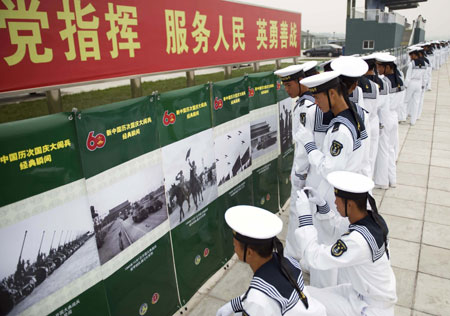 Soldiers watch photos at the Parade Photo Exhibition in Beijing, China, Sept. 24, 2009. A photo exhibition recording previous parades after the founding of the People's Republic of China in 1949 was held at Parade Village where all the soldiers who will join the parade on Oct.1 take part in practices. (Xinhua/Liu Jie)