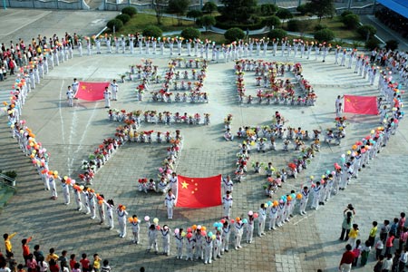 Pupils and their teachers line up in formations of heart pattern and Characters literally Long Lives to Homeland, while singing song of Ode to Homeland, on campus of Gongyuanlu Elementary School, in Zhijiang City, central China's Hubei Province, Sept. 24, 2009. Well over 1,100 pupils and teachers gather together for a song party to express their reverence and blessings to the homeland prior to the forthcoming 60th anniversary of the founding of the People's Republic of China. (Xinhua/Liu Weidong)