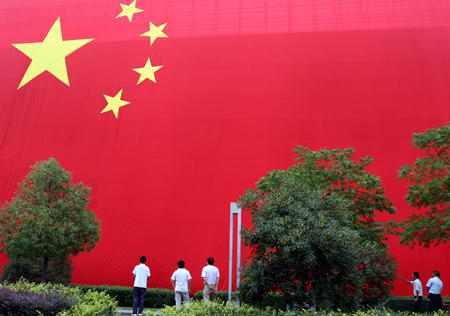 嵥eople look at a huge Chinese national flag with the area of 960 square meters, which is made to mark the upcoming 60th anniversary of the founding of the People's Republic of China, in Changxing, a city of east China's Zhejiang Province, Sept. 28, 2009. (Xinhua/Yue Deliang)