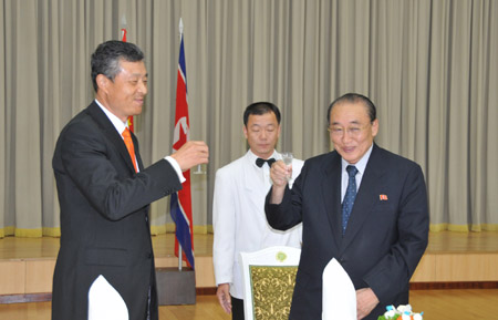 Liu Xiaoming (1st L), Chinese ambassador to the Democratic People's Republic of Korea (DPRK),and Yang Hyong Sop, vice-president of the Presidium of the Supreme People's Assembly of DPRK, toast during a grand reception to celebrate the 60th founding anniversary of the People's Republic of China, in Pyongyang, capital of DPRK, Sept. 28, 2009. (Xinhua/Yao Ximeng)
