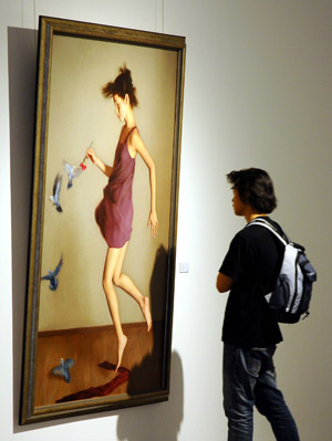 Visitors appreciate an oil painting at China's 11th National Oil