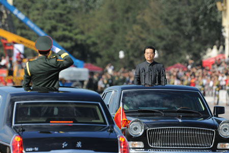 Hu Jintao, general secretary of the Central Committee of the Communist Party of China, Chinese president and chairman of the Central Military Commission, goes by car inspecting troops of the Chinese People's Liberation Army to take part in a military parade for celebration of the 60th anniversary of the founding of the People's Republic of China, in central Beijing, capital of China, Oct. 1, 2009. (Xinhua Photo)