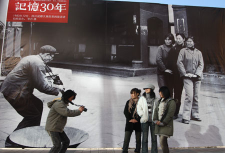 Two girls have their pictures taken at a photo exhibition in Beijing's Wangfujing area, Dec. 17, 2008. The show features about 800 photos taken across the country during the past three decades to highlight the major changes China has gone through since 1978. (Photo: China Daily/Asianewsphoto)