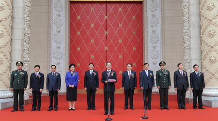 Chinese Premier Wen Jiabao (front), who is also a member of the Standing Committee of the Central Committee Political Bureau of the Communist Party of China, addresses the opening ceremony of an exhibition showcasing China's achievements since 1949 in Beijing, China, Sept. 19, 2009, to mark the 60th anniversary of the founding of the People's Republic of China. Li Changchun (5th R), a member of the Standing Committee of the Central Committee Political Bureau of the Communist Party of China, presided over the opening ceremony. (Xinhua Photo)