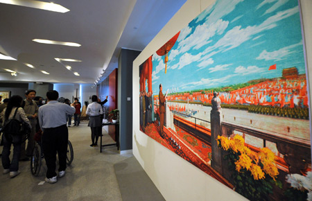 People visit the exhibition titled "Footstone, the 60 years past" in Beijing, capital of China, Sept. 26, 2009. The exhibition features the art achievements of People's Republic of China in the past 60 years. (Xinhua/Li Xiaoguo)