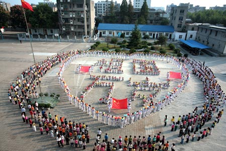 Pupils and their teachers line up in formations of heart pattern and Characters literally Long Lives to Homeland, while singing song of Ode to Homeland, on campus of Gongyuanlu Elementary School, in Zhijiang City, central China's Hubei Province, Sept. 24, 2009. Well over 1,100 pupils and teachers gather together for a song party to express their reverence and blessings to the homeland prior to the forthcoming 60th anniversary of the founding of the People's Republic of China. (Xinhua/Liu Weidong)