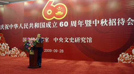 A reception is held by counselors and culture and history researchers of China's cabinet to celebrate the upcoming 60th founding anniversary of the People's Republic of China and the traditional Mid-Autumn Festival, in Beijing, capital of China, Sept. 28, 2009. (Xinhua/Zhang Duo)