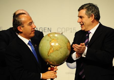 Mexican President Felipe Calderon (L) address the media after being presented with the the Globe International Award by British Prime Minister Gordon Brown (R) during the United Nations Framework Climate Change Conference in Copenhagen, Denmark, Dec. 17, 2009.(Xinhua/Zeng Yi)