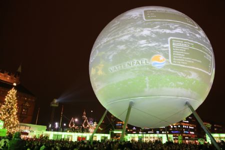 A giant model of the earth is illuminated by electricity generated by people's riding bicycles in front of the city hall of Copenhagen, Denmark, Dec. 7, 2009, on the occasion of the United Nations Climate Change Conference (COP15). (Xinhua/Lin Miao)