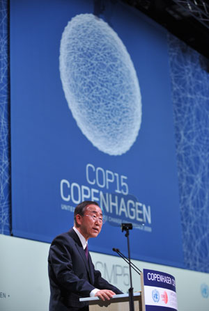 UN Secretary-General Ban Ki-moon addresses the opening ceremony of the high-level segment of UN Climate Change Conference in Copenhagen, capital of Denmark, Dec.15, 2009. (Xinhua/Wu Wei)