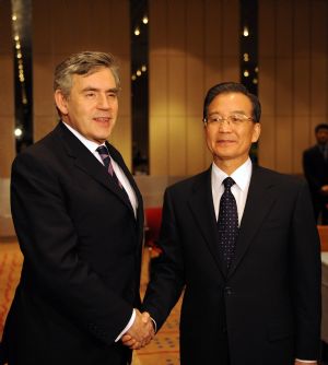 Chinese Premier Wen Jiabao (R) shakes hands with British Prime Minister Gordon Brown in Copenhagen, Denmark, Dec. 17, 2009. (Xinhua/Liu Jiansheng)