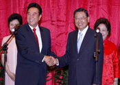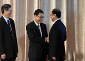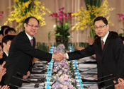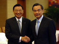 Head of the Chinese State Council's Taiwan Affairs Office Wang Yi talks with Chiang Pin-kung, Taiwan's Straits Exchange Foundation (SEF) chairman, in Chongqing Municipality of southwest China, on June 29, 2010.