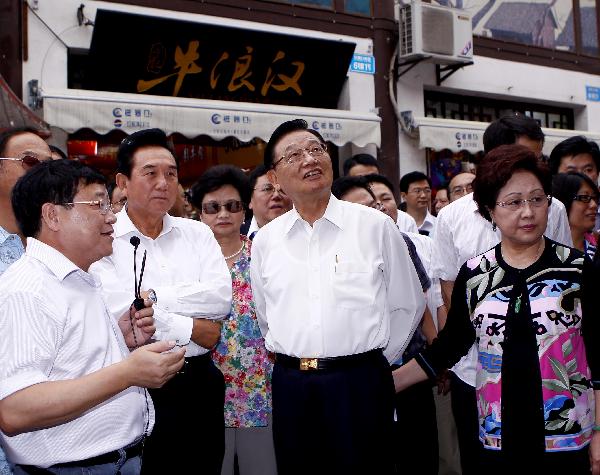 Chiang Pin-kung (2nd R), Chairman of the Taiwan-based Straits Exchange Foundation (SEF), visits the ancient town of Ciqikou in southwest China's Chongqing Municipality June 28, 2010. A delegation headed by Chiang Pin-kung arrived in Chongqing on Monday. (Xinhua/Chen Jianli)