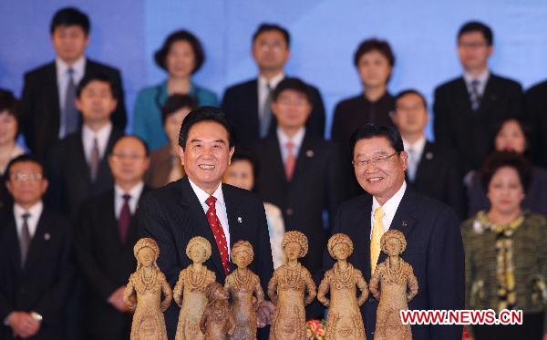 Chen Yunlin (L, Front), president of Chinese mainland-based Association for Relations Across the Taiwan Strait (ARATS) and Chiang Pin-kung (R, Front), chairman of the Taiwan-based Strait Exchange Foundation (SEF), exchange gifts after signing an agreement on cross-strait health cooperation in Taipei, southeast China's Taiwan, Dec. 21, 2010. (Xinhua/Song Lidong)