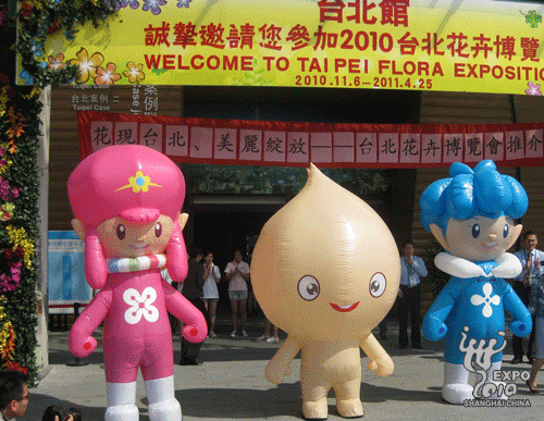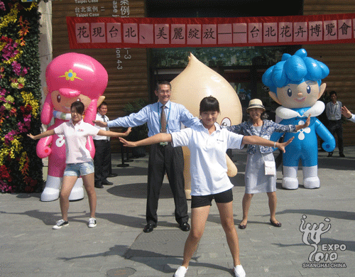 "Expo granny" Tomiyo Yamada and Taipei Pavilion director dance with the 2010 International Flora Exposition's mascots.