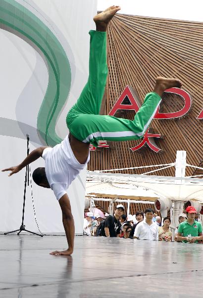 An actor performs Capoeira dance on the America Square during the national pavilion day of the Brazil Pavilion in the World Expo in Shanghai, east China, on June 3, 2010. A typical performance of Capoeira, a special dance form between dancing arts and martial arts, is held here by actors from China and Brazil to present the most important cultural symbol of Brazil on Thursday. (Xinhua/Liu Ying)
