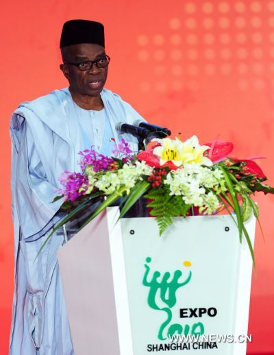 Nigeria's Minister of Commerce and Industry Jubril Martins-Kuye addresses during a ceremony celebrating the National Pavilion Day of Nigeria at the 2010 World Expo in Shanghai, east China, Aug. 21, 2010. (Xinhua/Li Baishun)