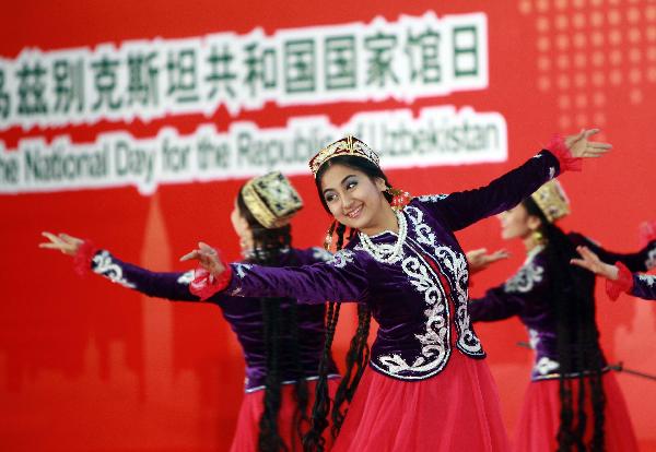 Dancers perform during a ceremony marking the National Pavilion Day for Uzbekistan at the 2010 World Expo in Shanghai, east China, Aug. 31, 2010. (Xinhua/Ren Long)