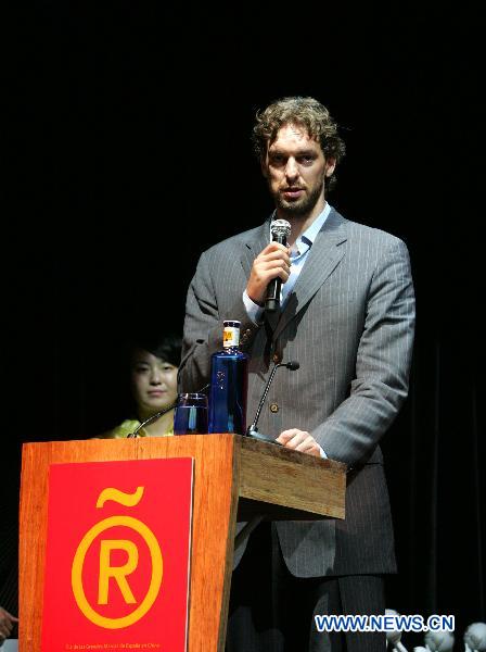 NBA Los Angeles Lakers player Pau Gasol addresses a promotion activity for brands of Spain held in the Spain Pavilion at the 2010 World Expo in Shanghai, east China, Sept. 1, 2010. (Xinhua/Meng Chenguang)
