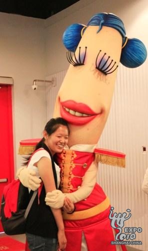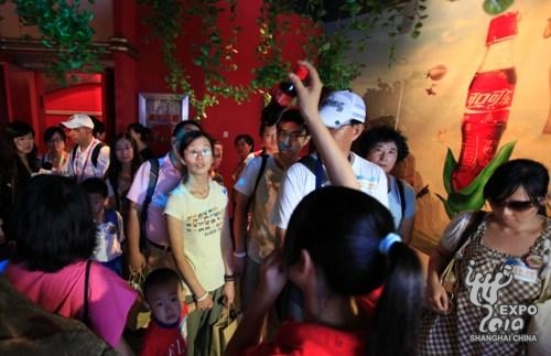 Lucky netizens pose for a picture in front of the Coca-Cola Pavilion in Puxi Site