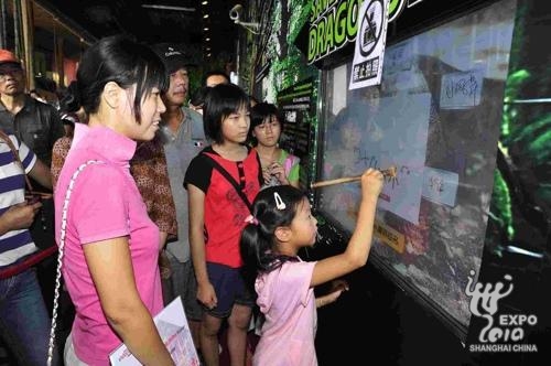 Ye Xinyi and her mother Ye Zhen visited the Expo site with a couple, Wang Kai and Wang Ye who are Ye Zhenˇs co-workers at an insurance company. The mother and daughter shared the happiness with them by giving them one of their gift air tickets.