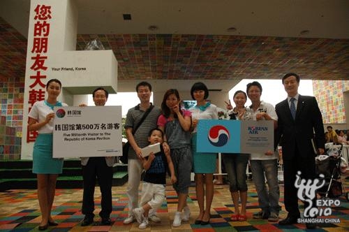 A couple from Fujian Province will visit the filming scenes of a Korean drama after winning round-trip air fare to Seoul as the 5 millionth visitor to the ROK Pavilion yesterday.