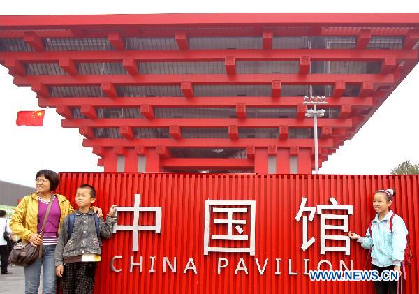 Visitors pose for photos in front of the China Pavilion at the World Expo Park in Shanghai, east China, Oct. 1, 2010. A series of activities are held at World Expo Park to mark China National Pavilion Day on Friday, during the 61st anniversary of the founding of the People's Republic of China. (Xinhua/Fan Jun)