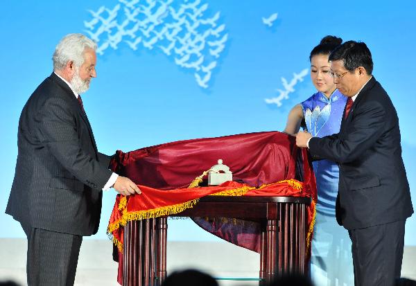 Yang Xiong (R), the deputy director of the executive committee for Shanghai Expo and vice mayor of Shanghai presents a gift to Vicente Loscertales (L), secretary-general of the Bureau of International Expositions (BIE), during an awarding ceremony in the World Expo Park in east China's Shanghai Municipality, Oct. 30, 2010. (Xinhua/Zhang Guojun)