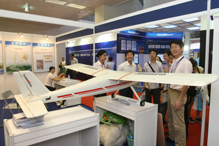 Visitors watch a novel model of drone aircraft, during the National Exposition on Geographic Information Applications and Maps, which opens at the Beijing Exhibition Center in Beijing, July 1, 2009. (Xinhua/Chen Xiaogen)