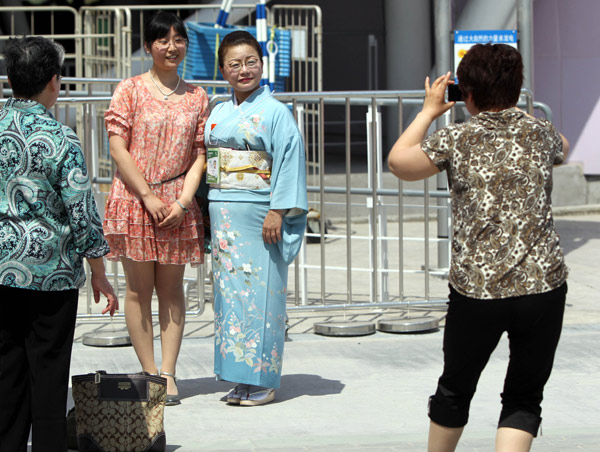 A visitor poses for a group photograph with a staff member of the Japan Pavilion dressed in traditional Japanese kimono in the World Expo in Shanghai, east China, on May 3, 2010. Visitors enjoy themselves when touring pavilions even in scorching weather in the World Expo on Monday, the third day of its opening. (Xinhua/Zhang Ming)