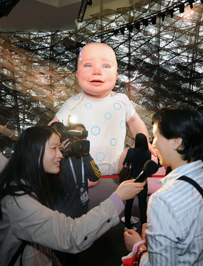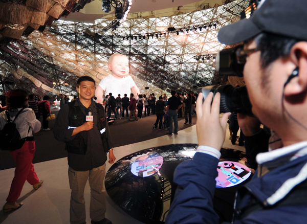 嵬eporters work in the Spain Pavilion on its media day at the 2010 World Expo in Shanghai, east China, May 5, 2010. (Xinhua/Zhao Ge)
