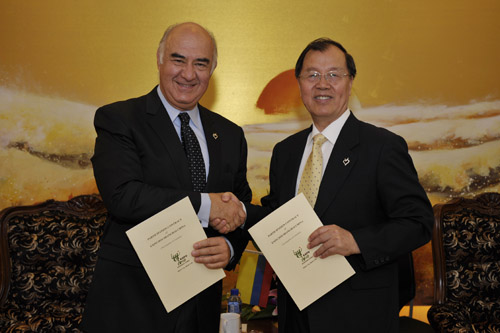 Gustavo Gaviria, the commissioner general for Colombia at World Expo 2010, hands over the country's participation contract to Hua Junduo, China's commissioner general for World Expo 2010.