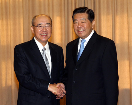 Jia Qinglin (R), chairman of the National Committee of the Chinese People's Political Consultative Conference, meets with Chinese Kuomintang Chairman Wu Poh-hsiung in Changsha, capital of central-south China's Hunan Province, July 10, 2009. (Xinhua/Liu Weibing)