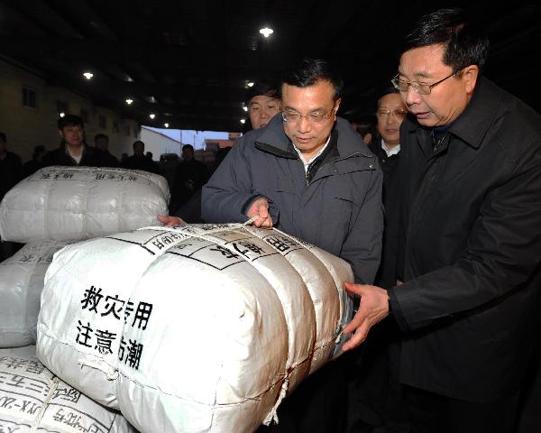 Chinese Vice Premier Li Keqiang (L, front) inspects the the urgent transportation of quake relief supplies in Shenyang, capital of northeast China's Liaoning Province, April 15, 2010. Li Keqiang on Thursday called for full commitment in the logistics work for the earthquake relief to ensure the basic livelihood of the people in quake-hit areas. (Xinhua/Li Tao)
