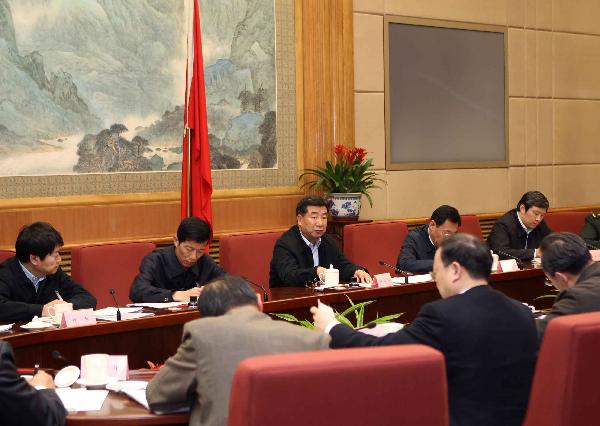Chinese Vice Premier Hui Liangyu (C), who is also the head of the State Council's quake-relief headquarters, addresses the quake-relief meeting in Beijing, capital of China, April 26, 2010. (Xinhua/Liu Weibing)