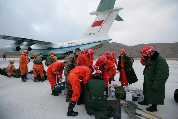 Two Il-76 aircraft have arrived at Yushu airport with rescuers and equipment from the national earthquake rescue team in Beijing in one, while the other has delivered 100 rescuers from China's mine exploration team, stationed in Chengdu.