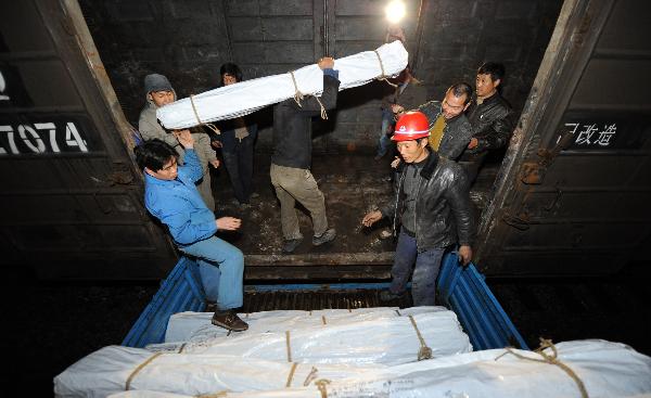 Workers load tents onto a train at the Hefei Railway Station in Hefei, capital of east China's Anhui Province, April 14, 2010. A total of 5,000 tents will be transported to the quake area in Yushu County, northwest China's Qinghai Province on April 15. About 400 people have died and 10,000 others were injured after a 7.1-magnitude earthquake hit Yushu early on Wednesday. (Xinhua/Guo Chen)