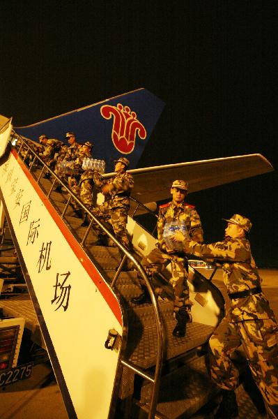 Rescuers load relief materials onto the plane at Bao'an Airport in Shenzhen, south China's Guangdong Province, April 14, 2010. A total of 111 border policemen were sent from Shenzhen to quake-hit Yushu County, northwest China's Qinghai Province, on Wednesday. (Xinhua/Chen Peigao)