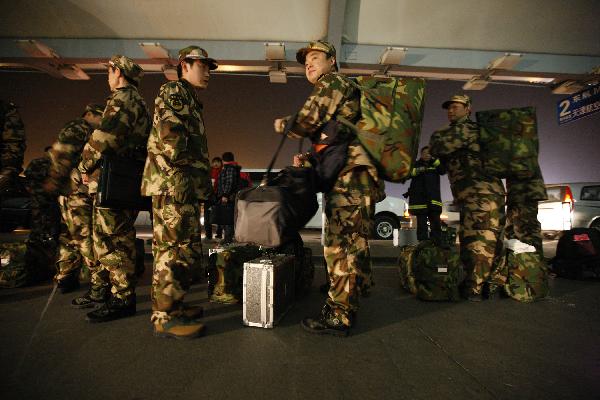 Rescuers prepare to board a plane at Xianyang International Airport in Xi'an, capital of northwest China's Shaanxi Province, April 15, 2010. A total of 108 rescuers were sent from Xi'an to quake-hit Yushu County, northwest China's Qinghai Province, on Wednesday. (Xinhua/Shen Bohan)