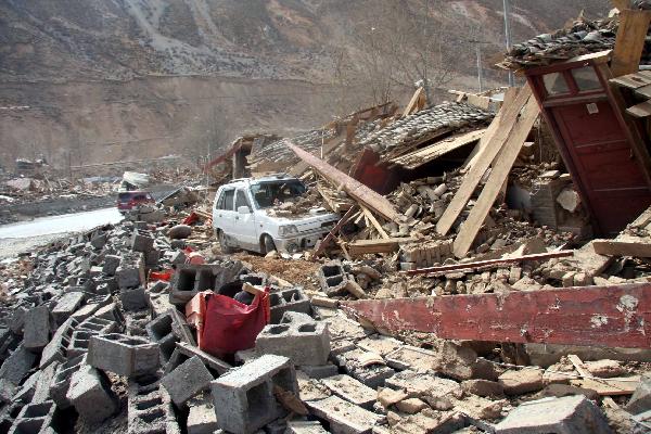Photo taken on April 14, 2010 shows the ruins of collapsed houses after an earthquake in Yushu County, northwest China's Qinghai Province. About 400 people have died and 10,000 others were injured after a 7.1-magnitude earthquake hit Yushu early on Wednesday. (Xinhua/Ren Xiaogang)
