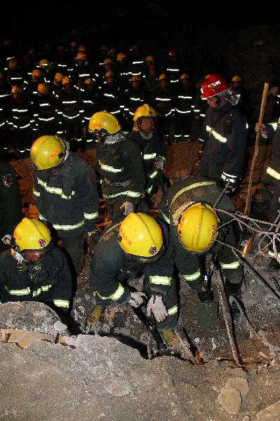 Rescuers work on the debris in Yushu County, northwest China's Qinghai Province, April 15, 2010. Joint efforts of the nationwide forces have been put into effect after a 7.1-magnitude earthquake hit Yushu early on Wednesday. (Xinhua/Xing Guangli)