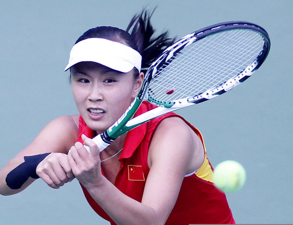 Peng Shuai of China returns the ball during the women's singles final of Tennis against Akgul Amanmuradova of Uzbekistan at the 16th Asian Games in Guangzhou, south China's Guangdong Province, Nov. 23, 2010.Peng Shuai won 2-0 and got the gold medal. (Xinhua/Chen Jianli)