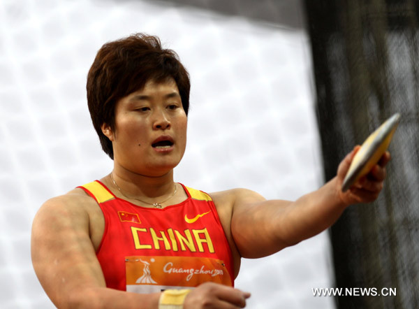 China's Li Yanfeng competes during the women's discus throw final of athletics at the 16th Asian Games in Guangzhou, south China's Guangdong Province, Nov. 23, 2010. Li Yanfeng claimed the title with 66.18 meters. (Xinhua/Liao Yujie)