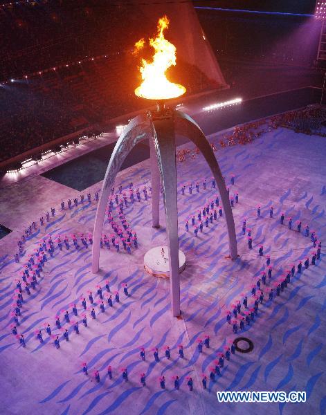 The stage is seen at the closing ceremony of the 16th Asian Games held at the Haixinsha Island in Guangzhou, south China's Guangdong Province, on Nov. 27, 2010. (Xinhua/Ren Zhenglai)