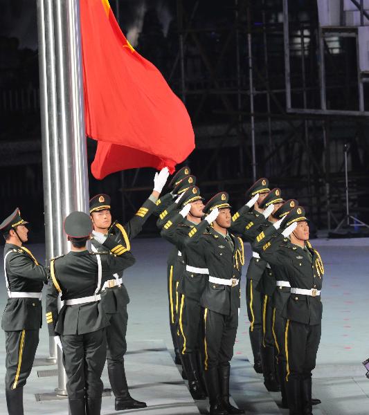 Chinese national flag is raised at the closing ceremony of the 16th Asian Games held at the Haixinsha Island in Guangzhou, south China's Guangdong Province, on Nov. 27, 2010. (Xinhua/Chen Shugen)