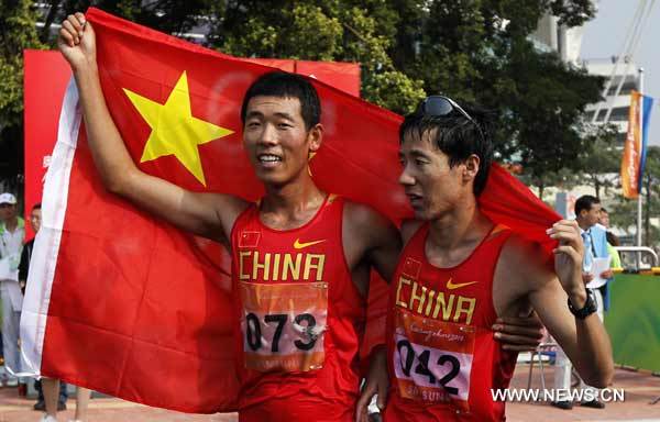 China's Wang Hao (L) and his teammate Chu Yafei celebrate after the men's 20km race walking final of Athletics at the 16th Asian Games in Guangzhou, south China's Guangdong Province, Nov. 21, 2010. Wang Hao won the gold medal in a time of 1 hour, 20 minutes and 50 seconds. Chu Yafei won the silver medal. (Xinhua/Wang Lili)