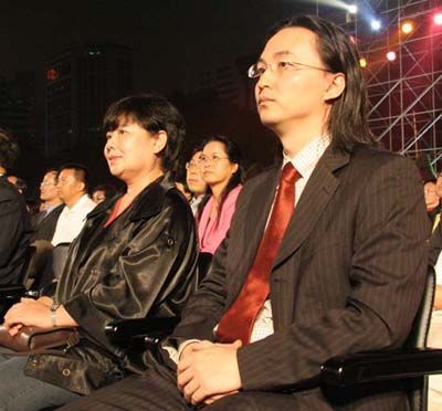 Mr. Zhang Qiang (right), lead designer of the Official Emblem of the 16th Asian Games and Ms. Hu Chuanni (left), head of the judging panel and a professor at the Guangzhou College of Fine Arts, at the emblem launch on November 26, 2006.